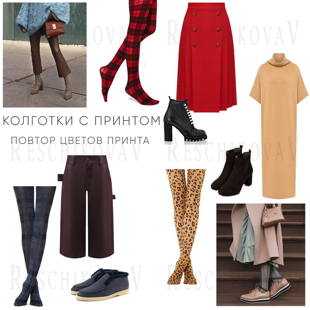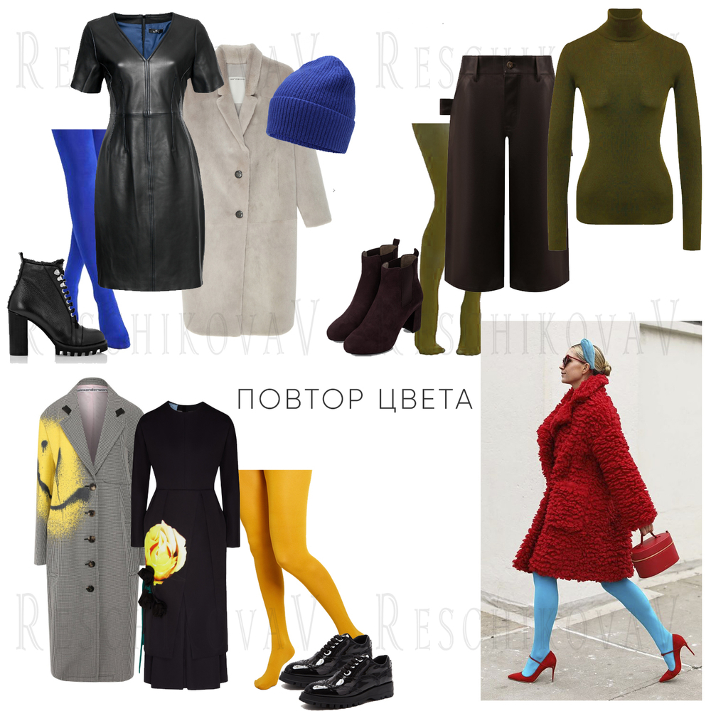 1. Opakující se barvy ze vzoru punčocháčů v položkách sady. Může se jednat o jednu hlavní barvu nebo dvě. Ideální by bylo opakovat všechny barvy ve stejném poměru jako vzor punčocháčů, ale to je složitější. Šatník by měl mít široký výběr kousků a je nutné mít dobré stylistické dovednosti.