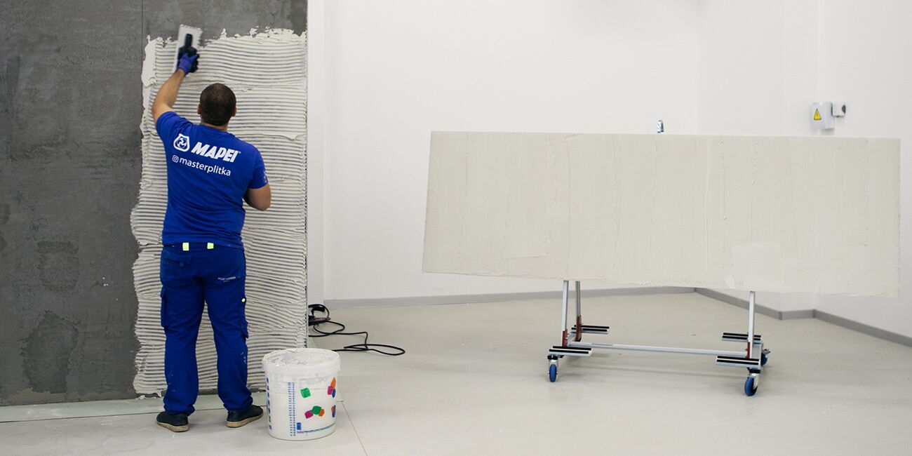 Pomocí hladítka naneseme na stěnu vrstvu lepidla na obklady a vyhladíme zubovou stěrkou. Naneste také trochu lepidla na montážní stranu produktu. Položte první dlaždici a jemně ji rukama zatlačte dolů, abyste zajistili, že pod ní nezůstanou žádné mezery. Pokračujte v pokládání řady, oddělujte desky od sebe pomocí křížů, odstraňte přebytečné lepidlo vlhkou houbou.