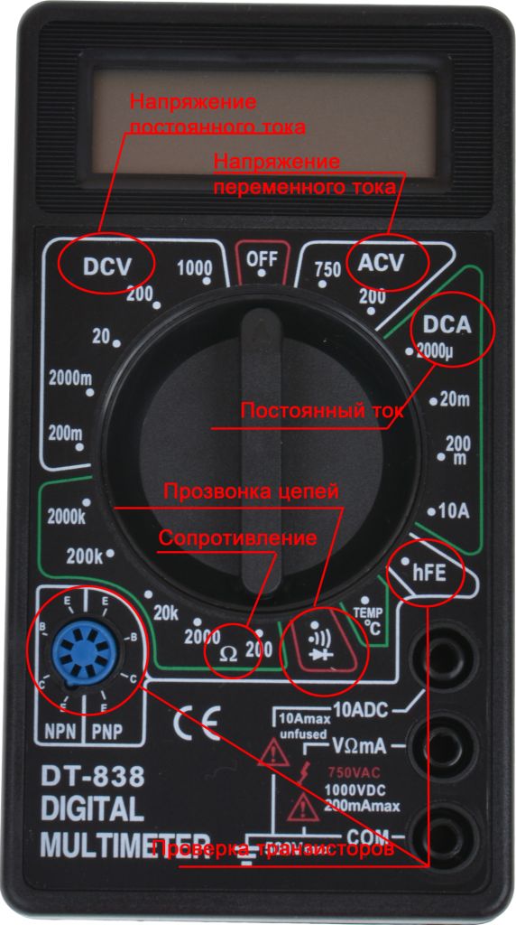Pomocí standardního multimetru můžete měřit střídavé napětí v síti (AC nebo V~), stejnosměrné napětí (DC nebo V=), velikost stejnosměrného proudu DCA (A=), odpor vodiče (Ω), zkontrolujte tranzistory (hFE) a také zazvoní elektrický obvod (Ó))).