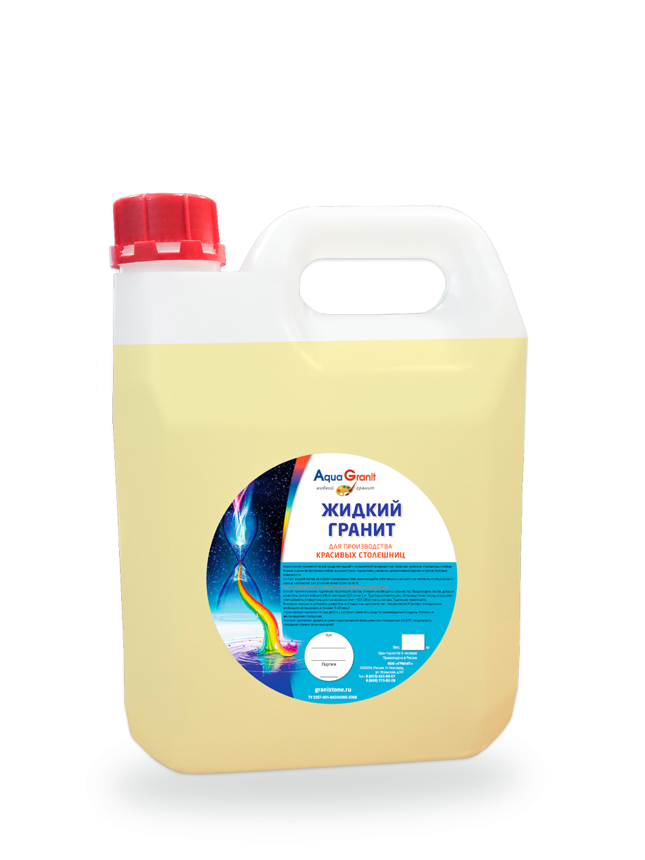 AquaGranit je vyroben na polymerní bázi a je nasycen speciálními technickými přísadami a dekorativními komponenty, které poskytují komfort při práci s ním ve výrobě. Materiál má vynikající krycí schopnost, která umožňuje vytvořit tenkou vrstvu, která neutahuje podklad. Výrobky z AquaGranitu se získávají bez vnitřního pnutí, geometricky