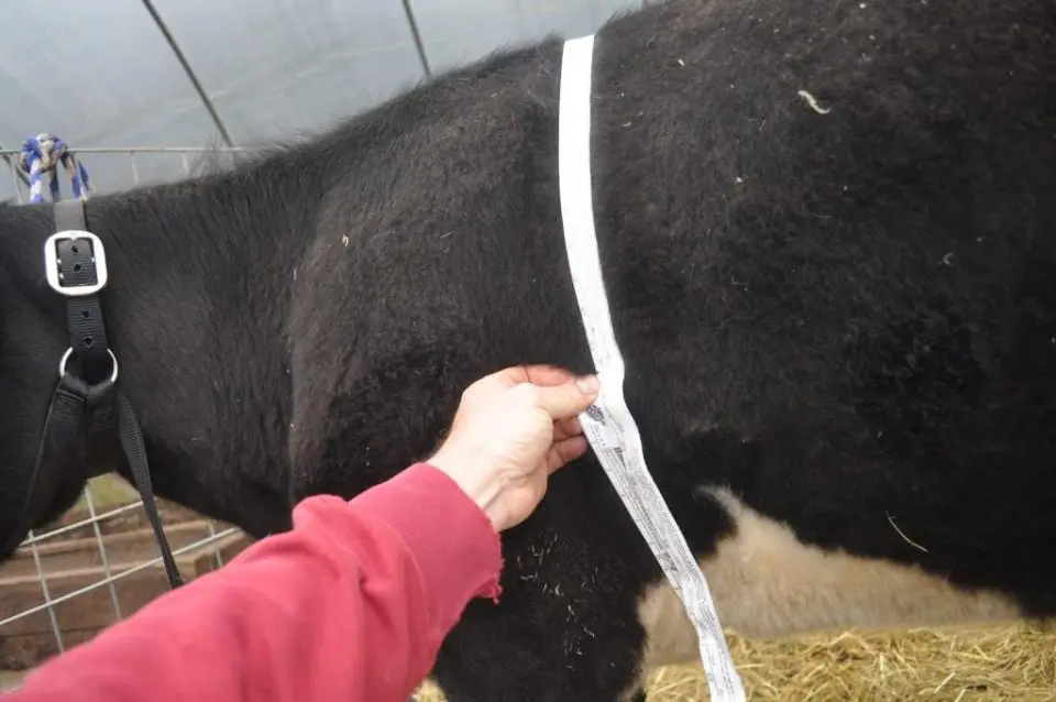 Umístěte krávu vedle pytle sena nebo obilí o známé hmotnosti (např. 50 kg). Pokud se zdá být dvakrát větší, je to doporučení 100 kg. Metoda je přibližná, ale pro hrubý odhad je dobrá.