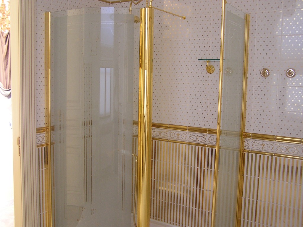 Pokud se rozhodnete pro instalaci skleněné příčky, měly by být armatury sprchového koutu spolehlivé, odolné vůči vlhkosti, ale ne masivní. Vyplatí se zvolit díly a spojovací prvky z niklu, chromu nebo mosazi. Luxusní designové možnosti zahrnují zlacení armatur.