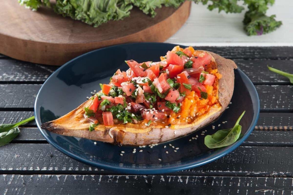 Vyzkoušejte náš recept na pečené batáty s náplní z čerstvých rajčat, špenátu a čedaru.